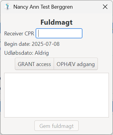 Når der trykkes på “plus”-ikonet åbner en popup, hvor der skal indtastes CPR på den person som skal have adgang.