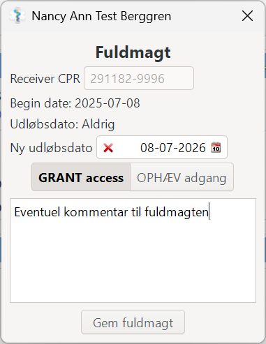 Vælg derefter om modtageren skal have TILDELT eller FRATAGET adgang. Alle tildelte fuldmagter skal have en udløbsdato. Denne skal aftales med patienten. En frataget adgang har ikke en udløbsdato. Bemærk at det kun er relevant at fratage en adgang, såfremt patienten er under 15 år.