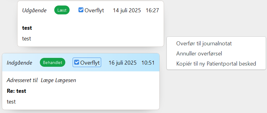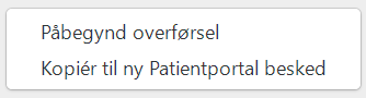 Hvis en eller flere beskeder til eller fra patienten via patientportalen er relevant for patientens journal, kan beskeder nemt kopieres som et journalnotat. Dette gøres ved højreklik på den grå baggrund inde i beskedtråden og vælge “Påbegynd overførsel”.